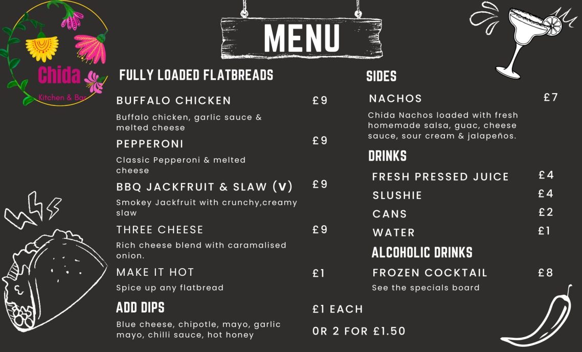 We’re a street food trailer serving up fully loaded flatbreads and nachos, made fresh and packed with bold flavour. Inspired by South American street eats and global comfort food, CHIDA brings you unforgettable bites, refreshing sips, and good vibes wherever we roll.